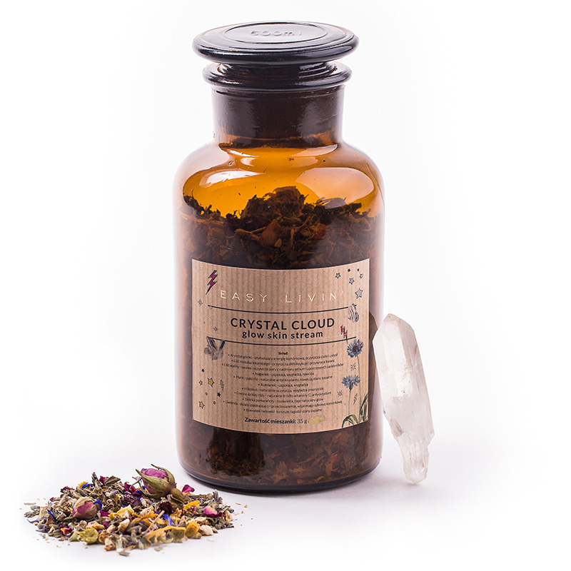 Kryształ górski, Mniszek lekarski - liście, Liście maliny, Kwiat nagietka, Płatki i pąki róż, Rumianek, Hibiskus, Owoce dzikiej róży, Skórka pomarańczy, Lawenda, Bławatek niebieski.