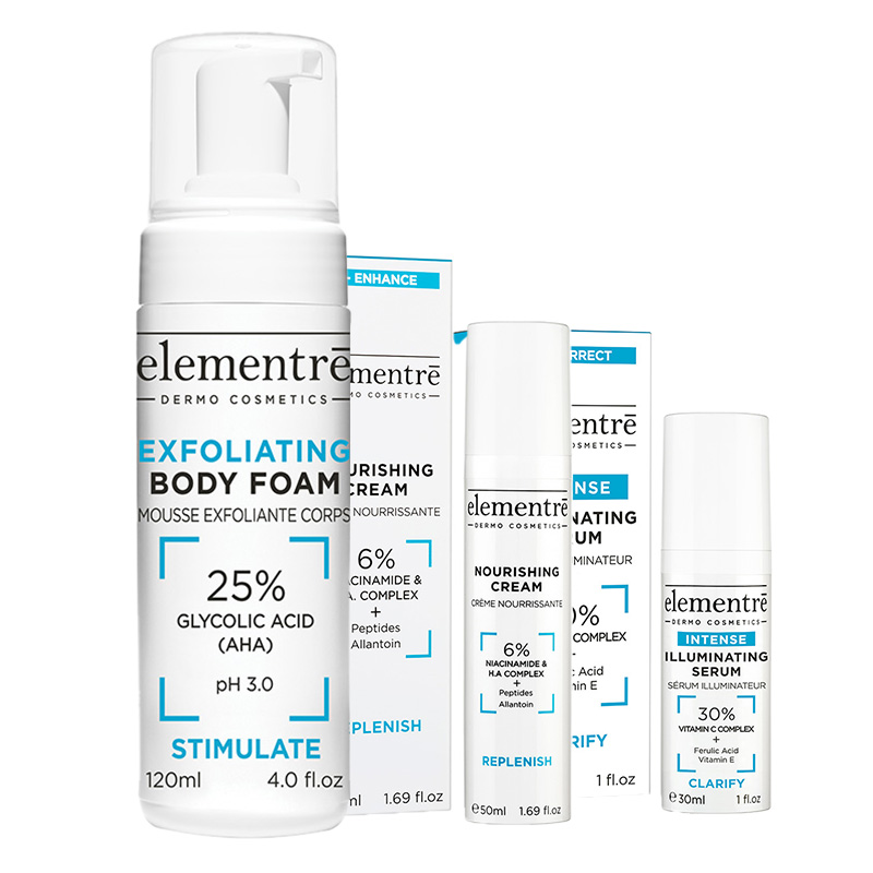 Dzięki stosowaniu Elementre Illuminating Serum koloryt skóry ulega wyrównaniu, przebarwienia stają się rozjaśnione, a struktura wygładzona.