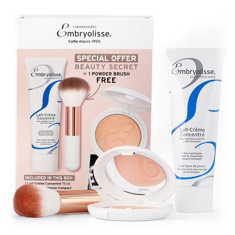 Zestaw Parisian Glow Beauty Secret. Zestaw składający się z dwóch bestsellerów marki Embryolisse, czyli Lait-Creme Concentre Kremu odżywczo-nawilżającego i Poudre Compacte Bonne Mine Pudru wygładzająco-brązującego oraz uniwersalnego, miękkiego pędzla do pudru. Połączenie właśnie tych dermokosmetyków w limitowanym zestawie stanowi sekret urody Paryżanek do osiągnięcia naturalnie pięknej i świetlistej cery.