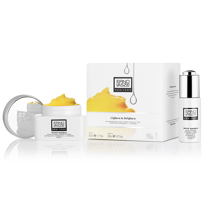 White Marble Dual Phase Vitamin C Peel - Dwufazowy peeling z wit. C, wyciągiem z marchwi i kwasem mlekowym. Dwuetapowy peeling oczyszczający rekomendowany dla skór, szarych, ziemistych, z przebarwieniami. Krok 1 delikatnie złuszcza skórę a krok 2 aktywuje działanie rozjaśniające i nawilżające. Zawarta w składzie witamina C redukuje ciemne plamy, rozjaśnia skórę oraz stymuluje produkcję kolagenu, olej z nasion marchwi pielęgnuje i tonizuje suchą, spierzchniętą skórę, jednocześnie pomagając zwalczać przebarwienia. Ponadto kwas mlekowy delikatnie złuszcza skórę, przygotowując ją do wchłaniania rozjaśniających, nawilżających i leczniczych składników odżywczych. Stosowany regularnie sprawia iż skóra staje się wygładzona, rozświetlona i odświeżona.