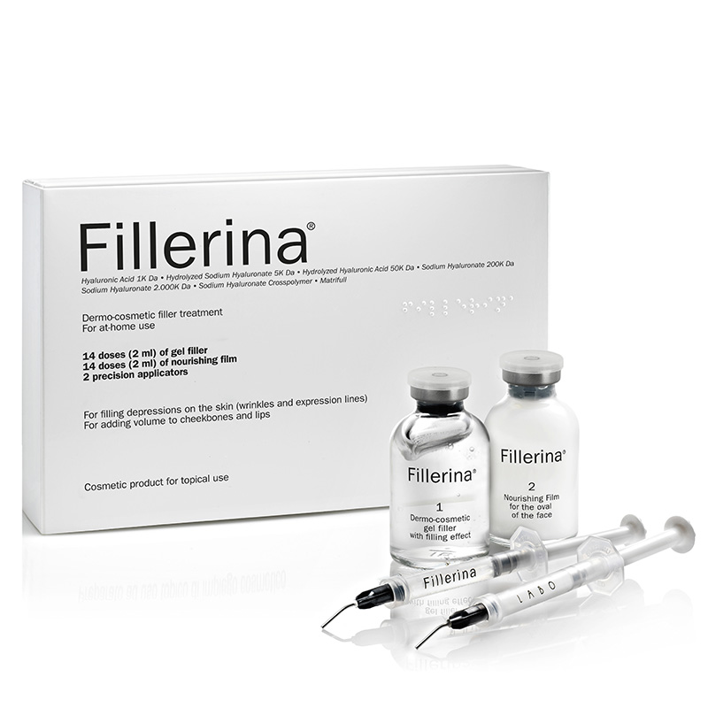 Preparat dermokosmetyczny Fillerina® do użytku domowego obejmuje stosowanie Żelu wypełniającego (Fillerina® 1) z wysoką zawartością cząsteczek kwasu hialuronowego oraz Filmu odżywczego (Fillerina® 2), który jest aplikowany po żelu.