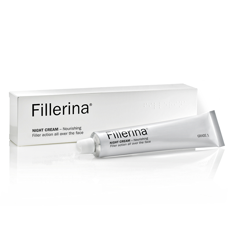Night Cream Nourishing Grade 1 Krem odżywczy na noc - stopień 1. Krem na noc zapewniający codzienną pielęgnację wypełniającą i modelującą owal twarzy. Swoje unikatowe działanie zawdzięcza zawarciu 6 rodzajów cząsteczek kwasu hialuronowego, który może w takim połączeniu wykazywać wielopłaszczyznową penetrację wgłąb skóry i wypełnienie zmarszczek na różnych poziomach. Obecne masło shea, olej z kiełków pszenicy oraz olej ze słodkich migdałów pozwalają na dogłębną nocną regenerację i odżywienie naskórka. Działanie przeciwzmarszczkowe wzmocnione zostało poprzez wzbogacenie formuły o retinol, peptydy i glikozaminoglikany. Tak dobrane składniki stanowią idealną kurację anti-aging. Krem można stosować osobno lub w połączeniu z innymi preparatami Fillerina.