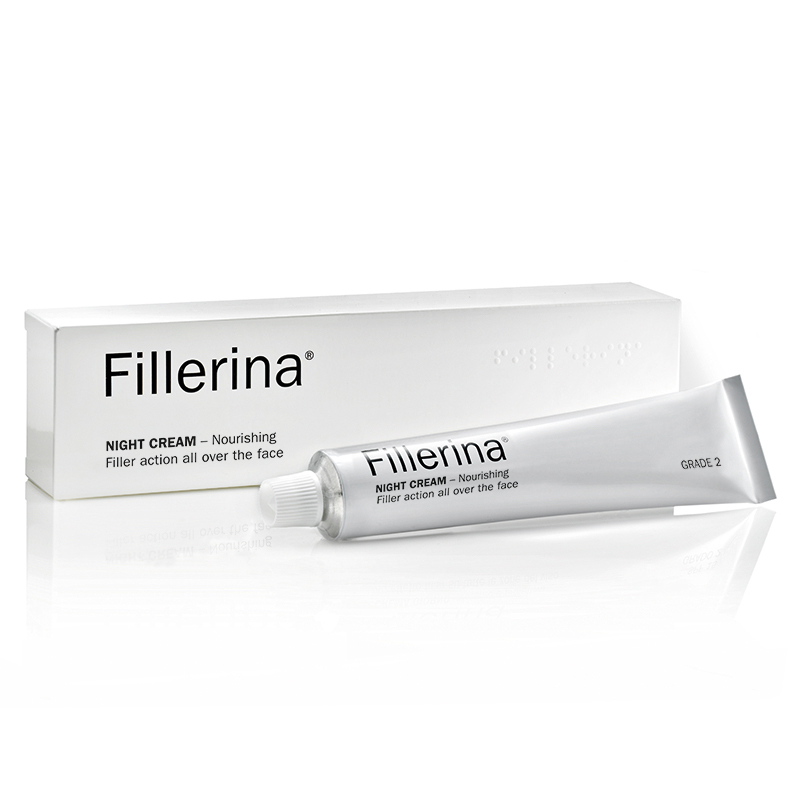 Night Cream Nourishing Grade 2 Krem odżywczy na noc - stopień 2. Krem na noc zapewniający codzienną pielęgnację wypełniającą i modelującą owal twarzy. Swoje unikatowe działanie zawdzięcza zawarciu 6 rodzajów cząsteczek kwasu hialuronowego, który może w takim połączeniu wykazywać wielopłaszczyznową penetrację wgłąb skóry i wypełnienie zmarszczek na różnych poziomach. Obecne masło shea, olej z kiełków pszenicy oraz olej ze słodkich migdałów pozwalają na dogłębną nocną regenerację i odżywienie naskórka. Działanie przeciwzmarszczkowe wzmocnione zostało poprzez wzbogacenie formuły o retinol, peptydy i glikozaminoglikany. Tak dobrane składniki stanowią idealną kurację anti-aging. Krem można stosować osobno lub w połączeniu z innymi preparatami Fillerina.
