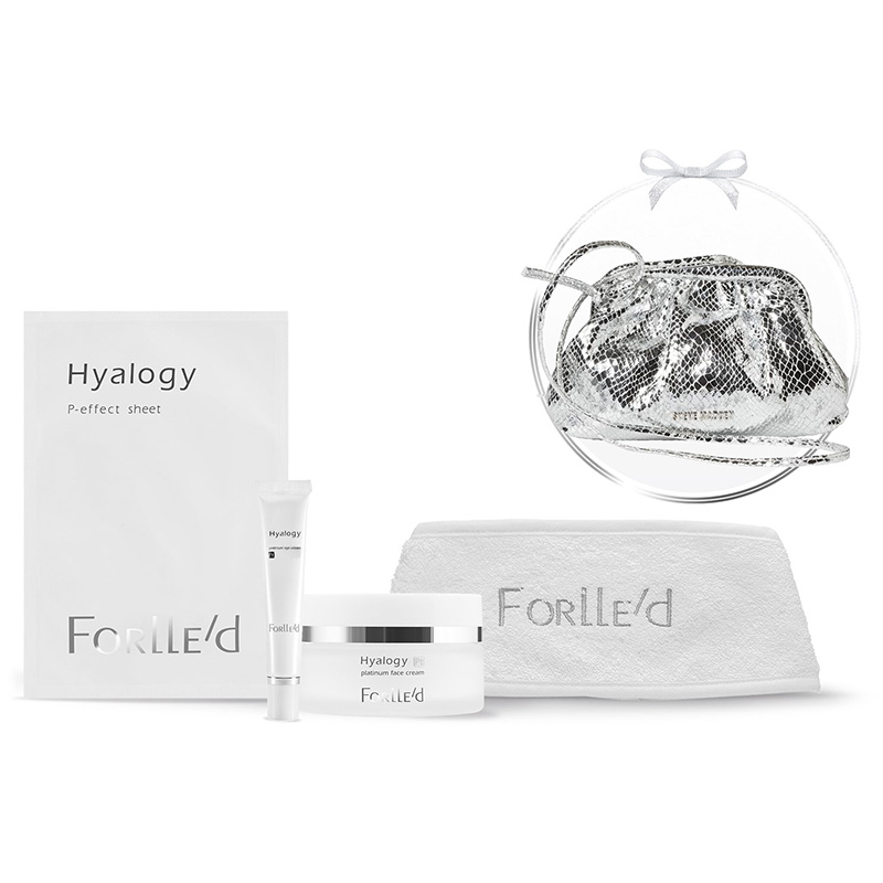 Hyalogy Platinum Eye Cream Antyoksydacyjny platynowy krem na okolice oczuSkwalan, Sodium chondroitin sulfate, Hialuronian sodu (opatentowany przez Forlle'd), Hydrolizowana błona skorupki jajka, Hydrolizowane białka konchiolina (proteina perłowa), Glycosyl trehalosa, Puder platynowy (opatentowa przez Forlle'd), Plantago major (ekstrakt z nasion babi zwyczajnej), Wyciąg z żeń-szenia Panax, Hydrolyzed prunus domestica (śliwa domowa), Salix alba (wyciąg z kory wierzby), Origanum majorana (ekstrakt z liści majeranku), Thymus serpillum (ekstrakt z macierzanki piaskowej), Hydrolizowany kolagen, Ceramidy 3 (opatentowane przez Forlle'd), Hydrolizowana keratyna i elastyny, Aminokwasy, Zjonizowane minerały (Ca2 +, K +, Zn2 +, Na +, Mg2 +) (opatentowany przez Forlle’d).