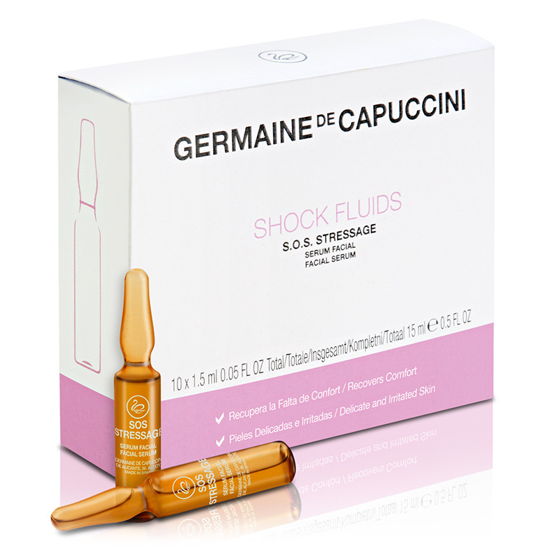 Shock Fluids S.O.S. Stressage - Intensywna pielęgnacja łagodząca podrażnienia. Terapia szokowa przeznaczona dla skóry wrażliwej, delikatnej i dotkniętej stresem. Moduluje próg tolerancji skóry, wzmacnia jej odporność, nadaje jej młodzieńczy wygląd i przywraca komfort. W ciągu 10 dni kuracji serum łagodzi stan zapalny i zmniejsza objawy podrażnienia, a także wzmacnia barierę ochronną skóry. Ponadto poprawia poziom nawodnienia skóry oraz redukuje zaczerwienienia.