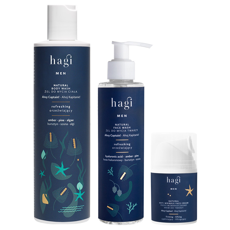 Przeciwzmarszczkowy Krem Ahoj Kapitanie Ujędrniająca, liftingująca i przeciwzmarszczkowa kuracja do twarzy dla mężczyznKompleks roślinny No.1 LIFT UP, galaktany z makroalgi czerwonej, ekstrakty z sosny, alg i bursztynu, kwas hialuronowy.