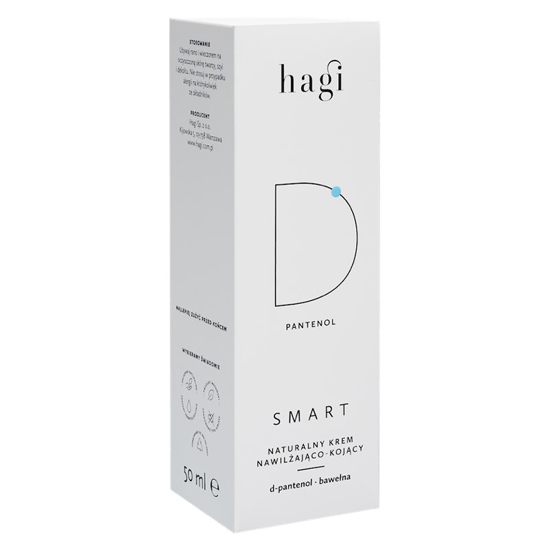Składowa Hagi Krem do Twarzy z D-Pantenolem Krem nawilżająco-kojący występuje w zestawie Zestaw Nawilżający SMART D w zmienionej objętości.