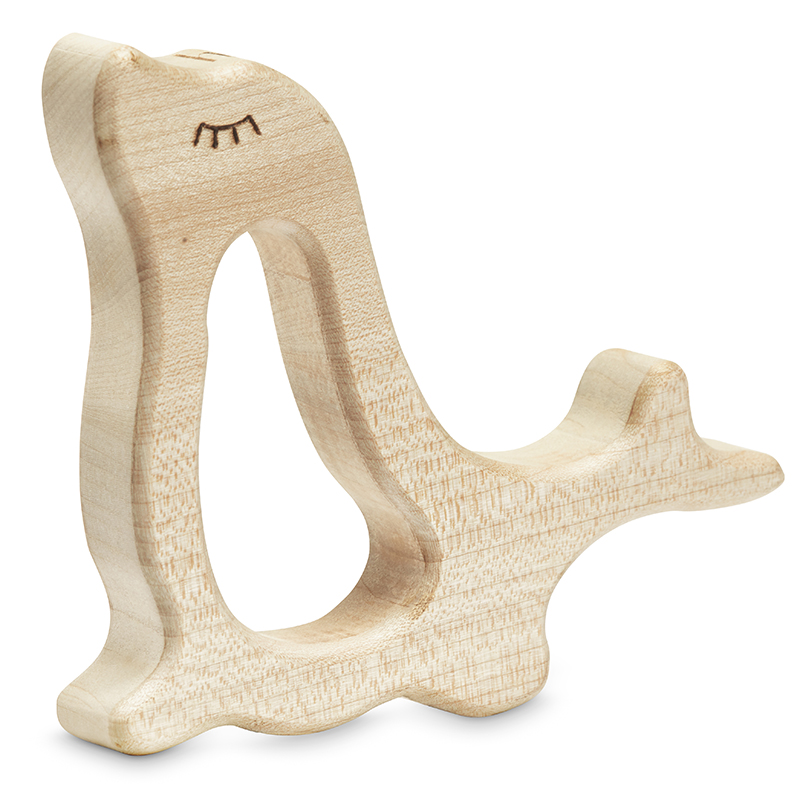 Drewniany gryzak - idealny gadżet dla niemowlaka. Wykonany z naturalnych materiałów w kształcie przyjaznej foczki ,doskonale pasuje do małych rączek. Ukoi bolące dziąsła podczas procesu wyrzynania. Wykonany został z delikatnego litego drewna.