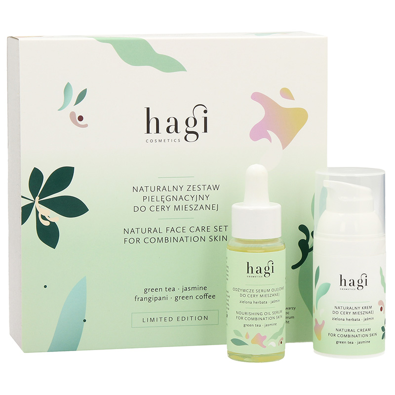 Składowa Hagi Naturalny Krem Do Cery Mieszanej Zielona herbata i Jaśmin występuje w zestawie Naturalny Zestaw Pielęgnacyjny Do Cery Mieszanej w zmienionej objętości.