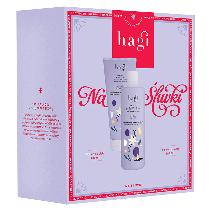 Uzupełnieniem pielęgnacji będzie połączenie kosmetyku z Hagi Balsam do Ciała Na Śliwki oraz Hagi Naturalny Scrub - Peeling do ciała z olejem z pestek śliwki i jojoba.