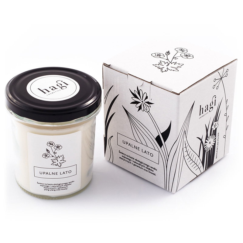 Świeca na bazie ekologicznego wosku sojowego - Upalne Lato. Zapach przywraca letnie wspomnienie oraz kwitnące kwiaty i ciepłe wieczory. Ekologiczny wosk sojowy w połączeniu z naturalnymi olejkami eterycznymi (geranium, ylang-ylang, limety) daje efekt wyciszenia emocji, poprawy aktywności oraz chęci do nawiązywania relacji. Świeca dzięki ekologicznym surowcom nie emituje toksyn.