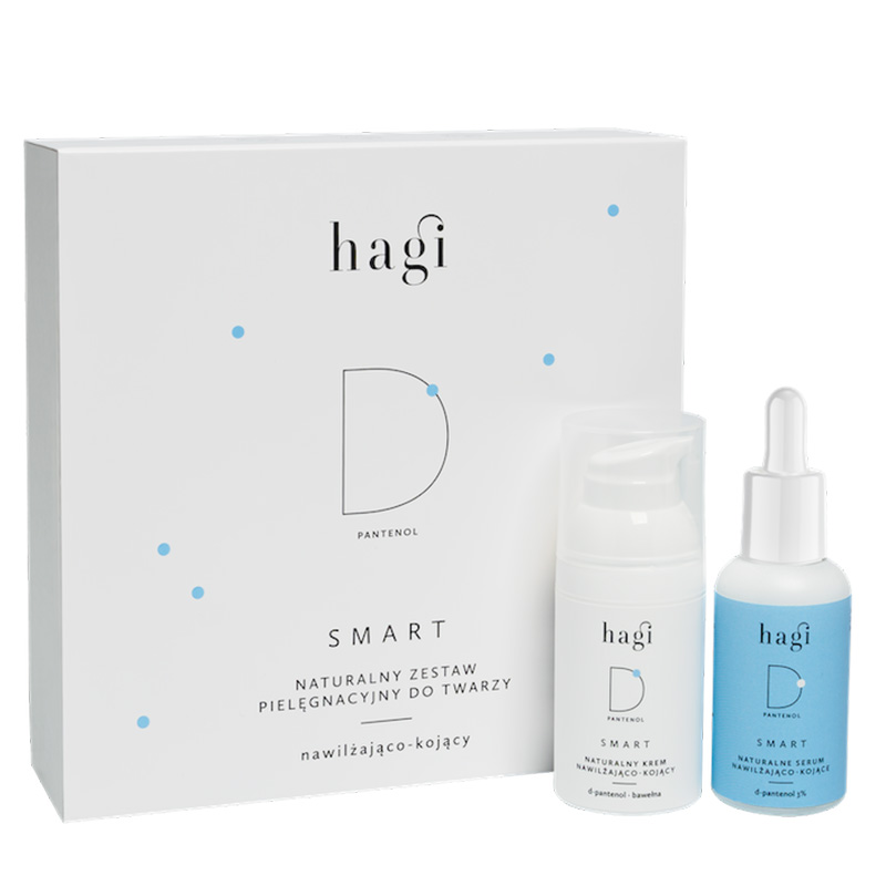 Składowa Hagi Krem do Twarzy z D-Pantenolem Krem nawilżająco-kojący występuje w zestawie Zestaw Nawilżający SMART D w zmienionej objętości.