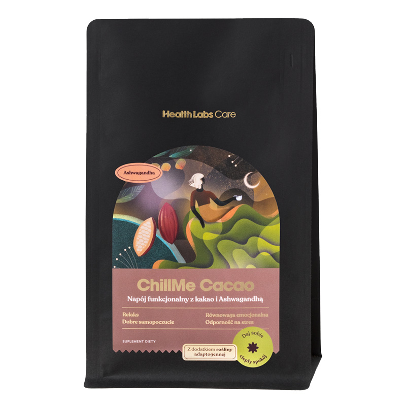 ChillMe Cacao to odprężający rytuał, który bazuje na zawartości kakao w proszku o obniżonej zawartości tłuszczu. Formułę wzbogacono ekstraktem z Ashwagandhy o właściwościach adaptogennych. Preparat zawiera wyłącznie naturalnie występujące cukry.