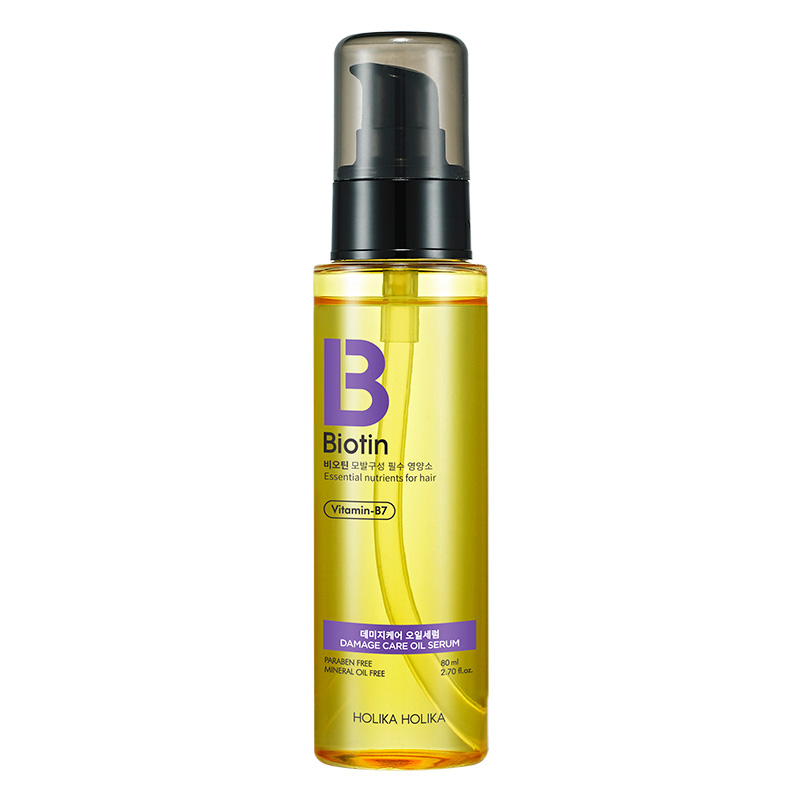 Biotin Damage Care Oil Serum - Serum do włosów z biotyną. Produkt przeznaczony dla włosów suchych, zniszczonych, łamliwych i puszących się. Chroni farbowane włosy przed blaknięciem koloru oraz silnie je regeneruje. Olejowe serum jest również znakomitym preparatem do ochrony przed wysoką temperaturą. Zawiera w składzie olej arganowy, z kamelii, ze słodkich migdałów i jojoba, które w połączeniu doskonale chronią przed uszkodzeniami, czynnikami zewnętrznymi oraz wysoką temperaturą. Włosy stają się wygładzona i pełne blasku. Formuła produktu zawiera składnik Meadowquat, która wpływa pozytywnie na kondycję włosa, zwiększa połysk oraz intensywność koloru. Biotyna zawarta w składzie, jako naturalny budulec włosa, wspomaga odbudowę zniszczeń, wzmacnia oraz odżywia włosy. Stają się one mniej łamliwe i podatne na rozdwajanie.