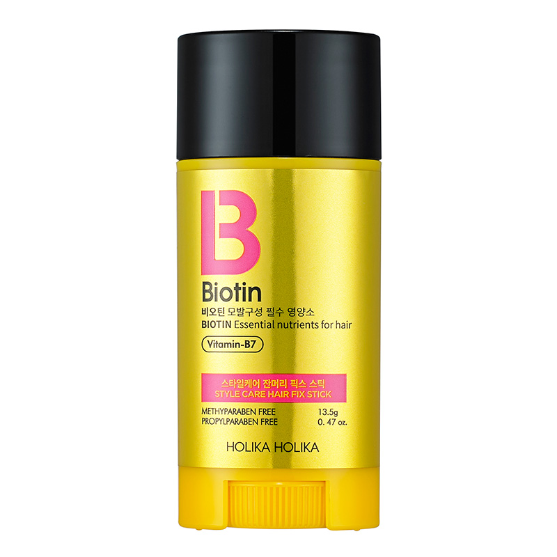 Biotin Style Care Fix Stick - Sztyft w postaci wosku z biotyną do utrwalenia niewielkich włosków w okolicy skroni, uszu lub czoła. Ujarzmia tzw. baby hair, które często ciężko wystylizować standardowym żelem lub woskiem. Przeznaczony zarówno dla kobiet (efekt idealnie gładkiej fryzury, wygładzenie kucyka), jak i mężczyzn (ujarzmienie odstających kosmyków, maksymalne wygładzenie fryzury). W składzie znajdziemy biotynę, która widocznie poprawia wygląd włosów. Wspomaga proces syntezy keratyny, co wpływa na wzmocnienie i odżywienie włosa.