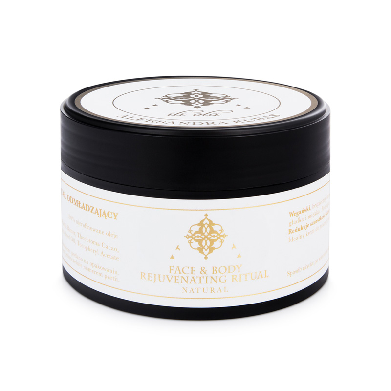 Face & Body Rejuvenating Ritual Natural - Naturalny mus do twarzy i ciała ma niebywale lekką konsystencję oraz nie posiada dodatkowych kompozycji zapachowych. Ma bezpieczną formułę, dzięki czemu sprawdzi się nawet w przypadku skóry wymagającej i wrażliwej. Skóra po użyciu odzyskuje miękkość, staje się jedwabiście gładka i świetlista. Masło redukuję uczucie swędzenia, ściągnięcia oraz łagodzi podrażnienia skóry. Polecane jest dla skóry odwodnionej oraz przesuszonej. Idealnie sprawdzi się również po opalaniu, gdy skóra jest zniszczona oraz podrażniona przez słońce. W składzie znajdziemy 50% zawartości nierafinowanego masła shea, który nie tylko odżywia skórę lecz działa przeciwstarzeniowo. Regularne stosowanie pozwoli również na spłycenie zmarszczek.
