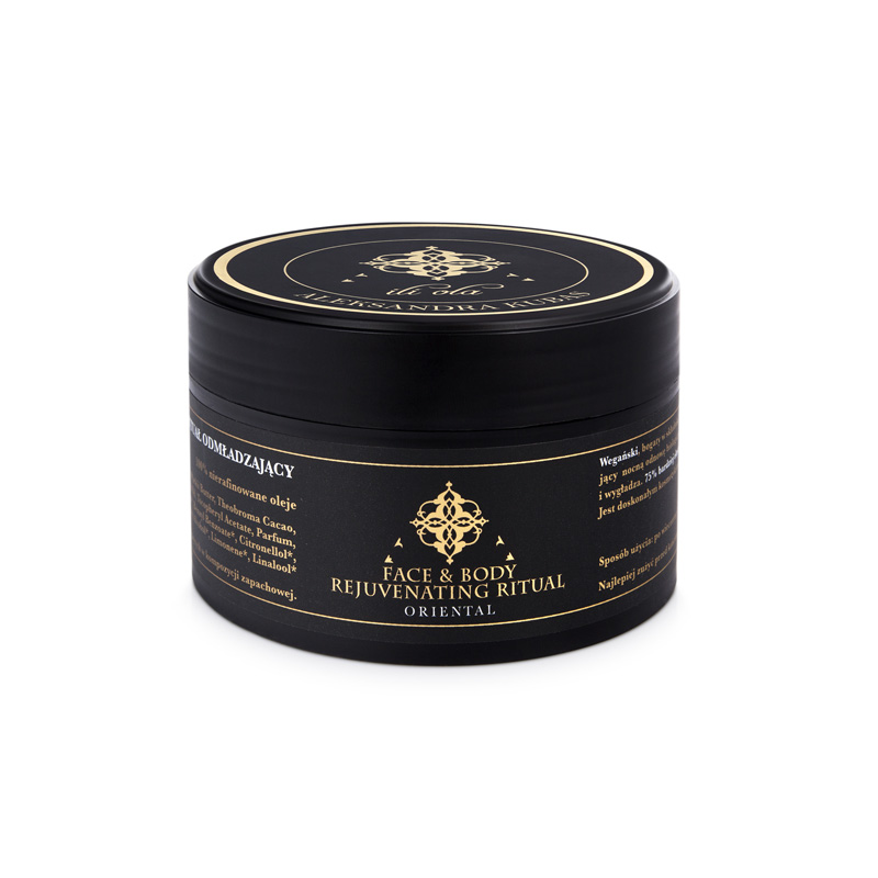 Face & Body Rejuvenating Ritual Oriental - Orientalny mus do twarzy i ciała jest to produkt wegański, zawierający składniki odżywiające skórę twarzy i ciała. Został stworzony do pielęgnacji skóry nocą. Przeznaczony do cery głównie dojrzałej, przesuszonej, wymagającej regeneracji. Natychmiastowo wygładza skórę oraz czyni ją bardziej miękką i nawilżoną. W składzie znajdziemy masło shea, które wykazuje nie tylko właściwości odżywiające, lecz również przeciwstarzeniowe oraz spłycające zmarszczki. Skóra staje się bardziej elastyczna. Wielokierunkowe działanie produktu dopełnia wspaniały, orientalny zapach kremu pochodzący z naturalnych olejków.