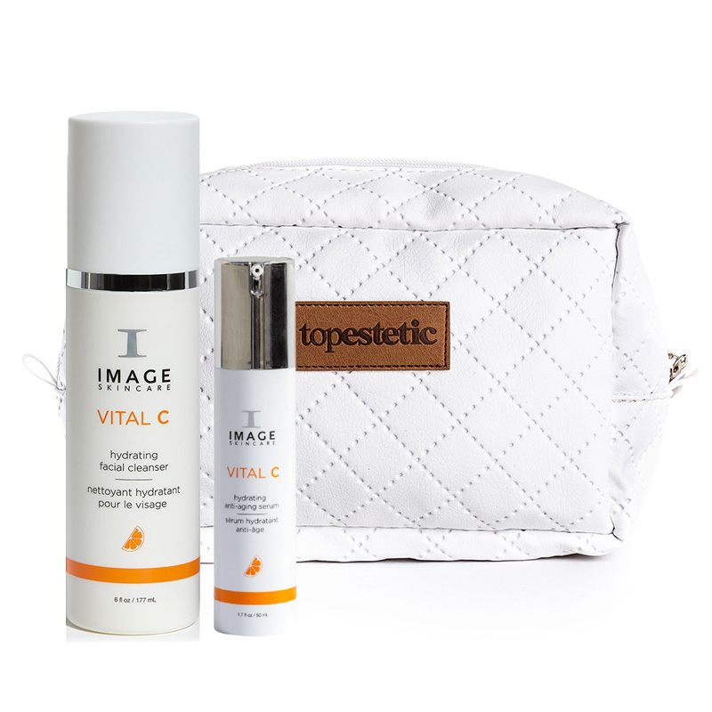 Vital C Serum + Vital C Cleanser. Komplet kosmetyków dedykowany do pielęgnacji każdego typu skóry, wymagającej rewitalizacji i nawilżenia. W skład zestawu wchodzi krem o wyjątkowo lekkiej konsystencji, kremowy preparat oczyszczający oraz elegancka kosmetyczka z logiem topestetic. Produkty opierają swoje działanie na witaminie C, która zapewnia ochronę antyoksydacyjną, odświeża, a także stymuluje produkcję kolagenu. W rezultacie skóra jest rozświetlona, gładka i odpowiednio nawilżona.