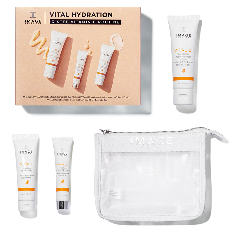 Składowa Image Skincare Vital C Hydrating Repair Creme 20% Silnie odżywczy i wygładzający zmarszczki krem z 20% wit. A,C i E występuje w zestawie Vital Hydration Travel Kit w zmienionej objętości.