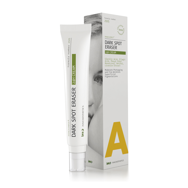 INNO-EXFO Dark Spot Eraser 24H Cream - Krem wskazany jest szczególnie dla wzmocnienia i przedłużenia terapii po zabiegu INNO-EXFO LIGHTENING. Preparat skutecznie hamuje produkcję melaniny, dzięki czemu zapobiega powstawaniu nowych przebarwień i rozjaśnia już istniejące. INNO-EXFO Dark Spot Eraser 24H Cream - jest nowoczesnym preparatem stosowanym w terapii przebarwień naskórkowych, mieszanych i skórnych.
