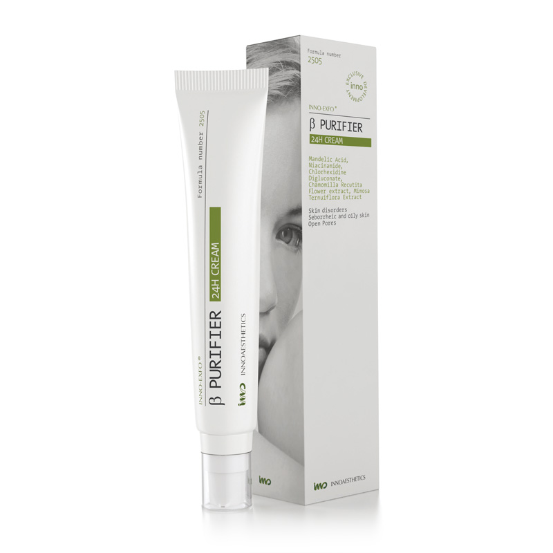 INNO-EXFO β Purifier 24H Cream - Krem wskazany jest szczególnie dla wzmocnienia i przedłużenia terapii po zabiegu INNO-EXFO INNO-EXFO GLyco-Age, Skin Recovery, Mandelage, T.C Age. Skutecznie łagodzi podrażnienia i przywraca skórze równowagę biologiczną oraz gwarantuje głęboką regenerację. Dzięki unikalnej kombinacji składników aktywnych, które pobudzają mikrokrążenie w skórze, preparat również wygładza i spłyca blizny potrądzikowe.