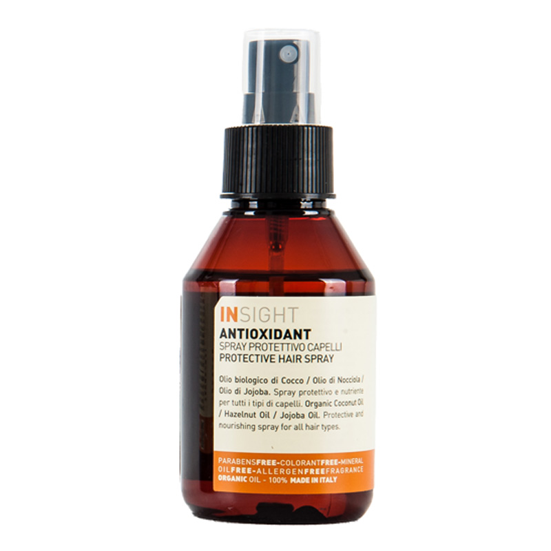 Antioxidant Protective Hair Spray - Spray do włosów z ochroną UV. Włosy tak samo jak skóra narażone są na działanie czynników zewnętrznych takich jak promieniowanie UV. Nadmierna ekspozycja na promienie słoneczne powoduje przesuszenie włosów oraz pogorszenie ich kondycji. Spray Insight zawierający ochronę przed promieniowaniem UV zapobiega uszkodzeniom orz wzmacnia i odbudowuje zniszczoną strukturę włosa. Kompozycja bogatych w kwasy tłuszczowe i przeciwutleniacze olejów roślinnych takich jak organiczny olej kokosowy, olej z orzechów laskowych oraz olej jojoba pozwala zachować piękny i zdrowy wygląd włosów. Dzięki swoim właściwościom ochronnym i regenerującym spray jest niezbędnikiem w letniej pielęgnacji włosów. Jeden produkt- wiele korzyści!