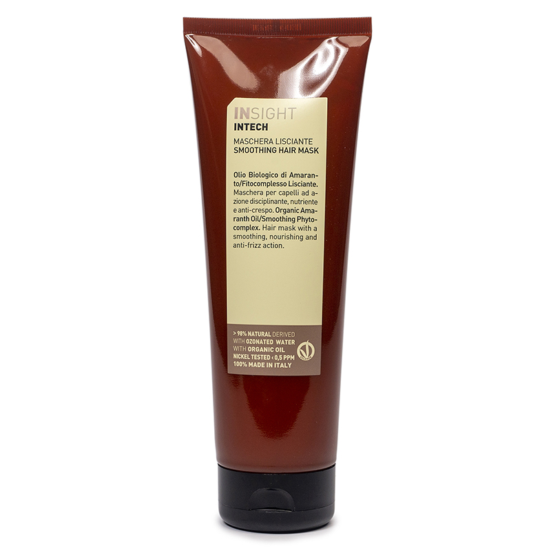 InSight Smoothing Hair Mask - Wygładzająca Maska do Włosów. Bogata w składniki odżywcze maska to idealny produkt do pielęgnacji włosów. Właściwości wygładzające sprawiają, że maska przedłuża efekt prostowania włosów i jednocześnie zapobiega ich przesuszeniu. Organiczny olej z amarantusa doskonale nawilża włosy i tworzy na ich powierzchni powłokę ochronną, dzięki którym nie ulegają one tak łatwo uszkodzeniu. Efekt idealnie gładkich włosów to zasługa fitokompleksu wygładzającego, w skład którego wchodzą fermentowane oleje m.in. arganowy, z nasion zielonej herbaty, ze słodkich migdałów. Bogata formuła maski działa na włosy na dwa sposoby- wygładza i prostuje włosy oraz głęboko odżywia. Szczególnie polecana dla włosów wysokoporowatych, suchych i puszących się.