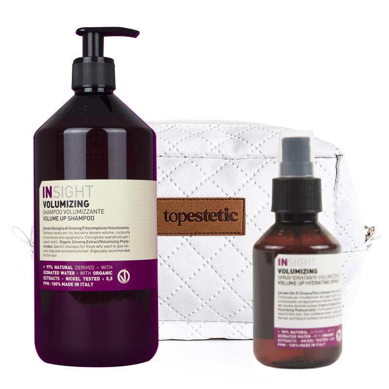 Volumizing Volume Up Hydrating Spray + Volumizing Volume Up Shampoo + Kosmetyczka - ZESTAW Nawilżający spray dodający objętości + Szampon zwiększający objętość + Biała, pikowana kosmetyczka. Cienkie, przyklapnięte włosy potrzebują odpowiedniej pielęgnacji, aby zyskać pożądaną objętość. Kosmetyki InSight bazujące na naturalnych ekstraktach roślinnych pozwalają odbić włosy od nasady i nadać im objętości. Poza dodaniem objętości włosy są doskonale nawilżone i odzyskują blask.