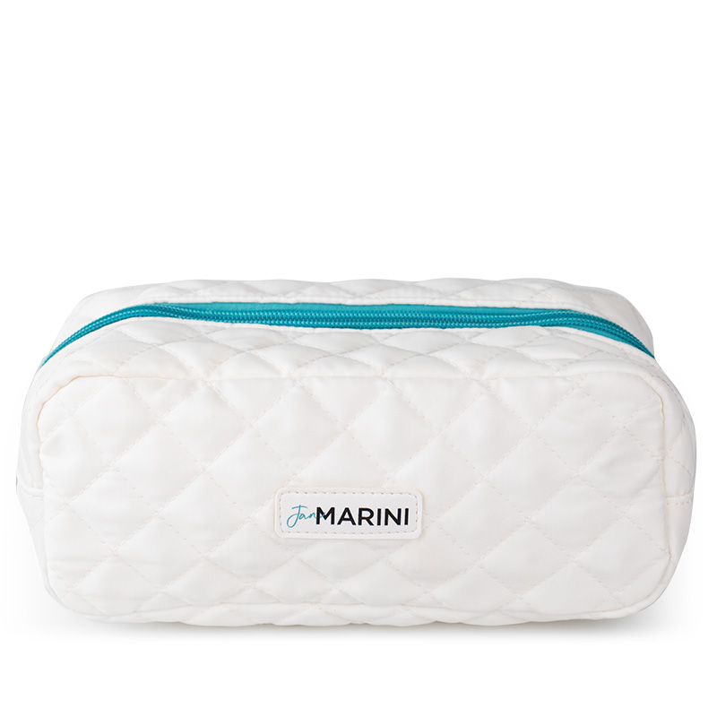 Kosmetyczka biała z niebieskim suwakiem, logo marki Jan Marini oraz nadającym elegancki charakter geometrycznym tłoczeniem. To praktyczny dodatek, który jest niezastąpiony w podróży, jak i w domu na przechowywanie różnego rodzaju akcesoriów i kosmetyków. Posiada wewnątrz jedną kieszonkę zamykaną na suwak. Jest bardzo pojemna. Jej wymiary to: 10cm x 10,5cm x 24cm.