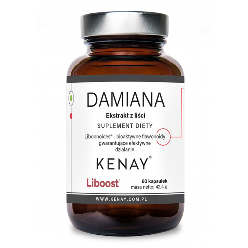 Kenay Damiana Ekstrakt z liści to suplement diety przeznaczony dla osób dorosłych, stanowiący uzupełnienie codziennej diety w naturalne składniki pochodzenia roślinnego. Preparat zawiera ekstrakt z liści damiana (Turnera diffusa), standaryzowany na zawartość 1,5% bioaktywnych flawonoidów Liboonoides® – w tym glikozydów luteoliny, glikozydów apigeniny i flawonoidów aglikonowych.