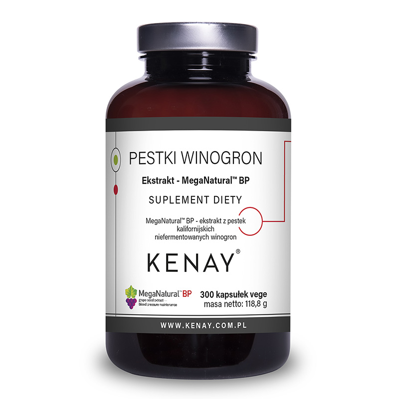 Produkt Kenay Pestki Winogron zawiera standaryzowany ekstrakt MegaNatural®-BP™, pozyskiwany z pestek niefermentowanych winogron uprawianych w Kalifornii. Dzięki wysokiej zawartości polifenoli suplement stanowi źródło naturalnych związków pochodzenia roślinnego.
