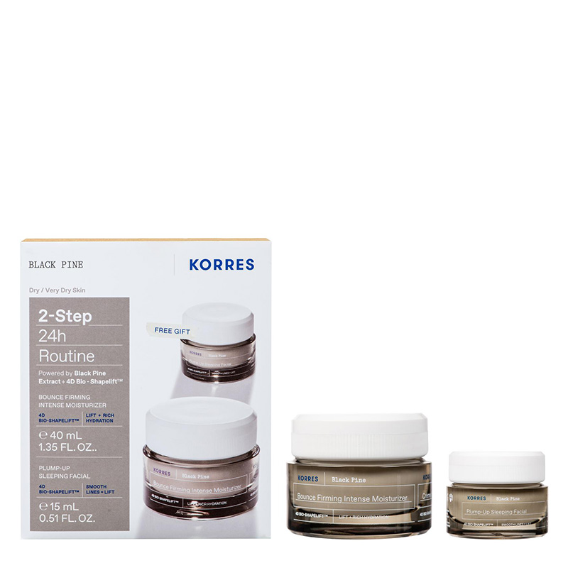 Składowa Korres Plump-Up Sleeping Facial Krem na noc występuje w zestawie Black Pine 2 Step 24h Routine w zmienionej objętości.
