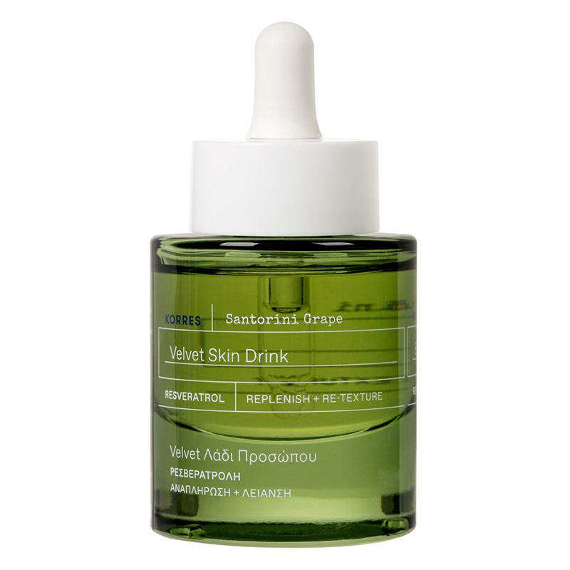 Santorini Grape Velvet Skin Drink w swojej formule posiada ekstrakt z winogron z Santorini stanowiący bogactwo antyoksydantów niwelujących szkodliwe działanie wolnych rodników tlenowych, a dodatkowo składnik ten silnie odżywia i regeneruje skórę. Co więcej, ekstrakt z winogron zawiera taniny obkurczające pory skóry i normalizujące pracę gruczołów łojowych.