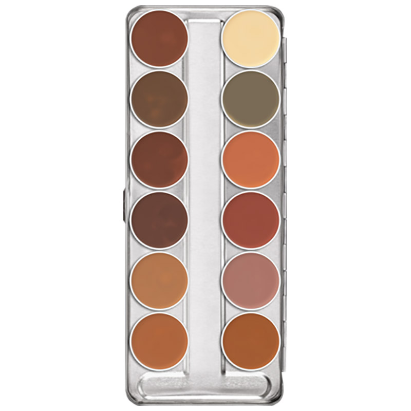 Dermacolor Camouflage Creme - Paleta 12 kol. kamuflaży (kolor B). Profesjonalna paletka do kamuflowania wszelkich niedoskonałości na skórze. Idealnie sprawdzi się w przypadku przebarwień, odbarwień skórnych np. w przebiegu bielactwa, w wyniku starzenia się skóry. Skutecznie zakrywa tatuaże, blizny, naczynka, żylaki itp. Produkt jest mocno napigmentowany dlatego już niewielka ilość preparatu wystarczy aby zakryć niedoskonałości. Produkt jest bardzo wydajny. W zwiększeniu trwałości produktu pomoże wykończenie makijażu pudrem Fixing Powder i utrwalaczem Fixing Spray. Dzięki temu makijaż stanie się wodoodporny oraz będzie bardziej odporny na ścieranie. Użycie tych produktów gwarantuje również ochronę przed promieniowaniem słonecznym. Produkt zaaplikowany oraz utrwalony zgodnie z zaleceniami utrzymuje się na skórze nawet do 36 godzin. Dzięki obecności dwunastu różnych odcieni kamuflażu można uzyskać kolor dopasowany do prawie każdej karnacji, za pomocą mieszania kolorów. W celu jak najlepszej aplikacji oraz uzyskania perfekcyjnego wyglądu warto rozgrzać produkt na grzbiecie dłoni, co pozwoli na lepsze stopienie się go ze skórą.