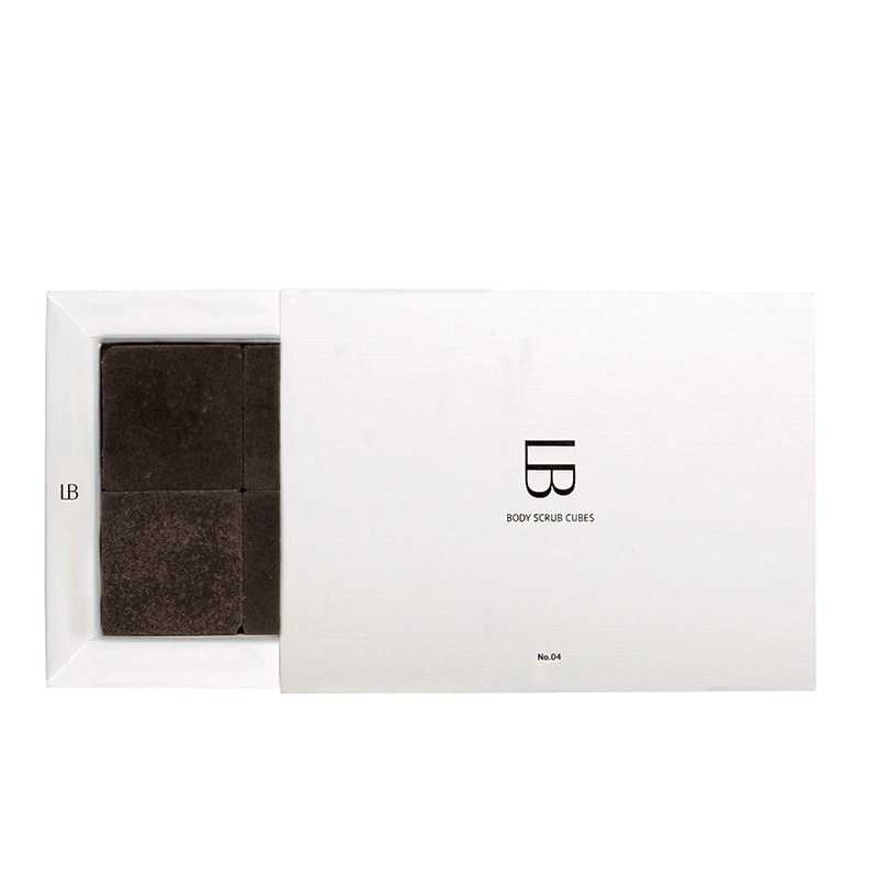 Każda kostka Body Scrub Cubes No. 04 wykonana jest na bazie masła kakaowego, oleju z orzechów makadamia oraz marokańskiej glinki Ghassoul. Wzbogacono je również o sól himalajską i pestki czarnego bzu, jako element złuszczający oraz olejek palo santo dla wyjątkowych doznań węchowych.