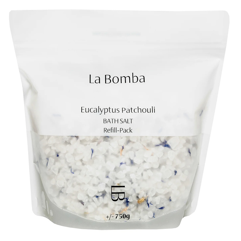 Relaksująca sól morska do kąpieli łącząca w sobie wyjątkowe właściwości eukaliptusa i paczuli.
