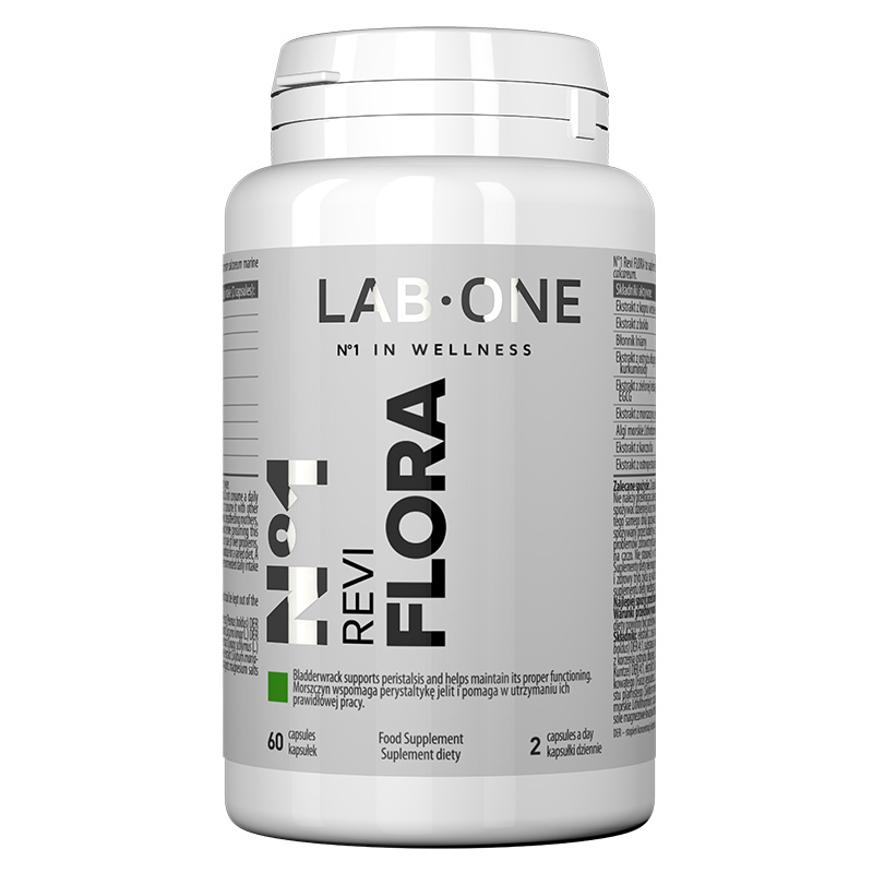 Formuła produktu Lab One Revi Flora zawiera dziewięć ekstraktów roślinnych, w tym ekstrakt z kopru włoskiego, kurkumy, zielonej herbaty, morszczynu, karczocha oraz ostropestu plamistego.