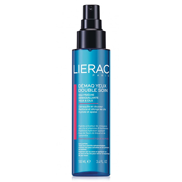 Demaq Yeux Double Soin - Płyn do demakijażu oczu przyspieszający wzrost rzęs. Delikatna skóra wokół oczu często ulega podrażnieniom oraz nadwrażliwości. Agresywne składniki oczyszczające, znajdujące się w klasycznych płynach do demakijażu niekorzystnie oddziałują na skórę oraz rzęsy, co skutkuję nadmiernym ich wypadaniem. Lierac stworzył płyn do demakijażu, który nie tylko usuwa makijaż lecz również pobudza wzrost rzęs. Posiada bardzo wygodną formę mgiełki, która po użyciu nie pozostawia lepkiej warstwy na skórze oraz nie obciąża powiek. Pantenol wraz z chabrową i rumiankową wodą kwiatową doskonale łagodzą podrażnienia oraz podnoszą poziom nawilżenia skóry. Dochodzi do redukcji opuchnięć oraz zmniejszenia stanów zapalnych. Czynnikiem wzmacniającym rzęsy oraz hamującym ich wypadanie jest tripeptyd oraz witamina z grupy B. W składzie nie znajdziemy składników barwiących, siarczanów, składników zapachowych oraz parabenów. Skład produktu był testowany okulistycznie. Produkt jest dostosowany do osób noszących szkła kontaktowe oraz posiadających wrażliwe oczy.