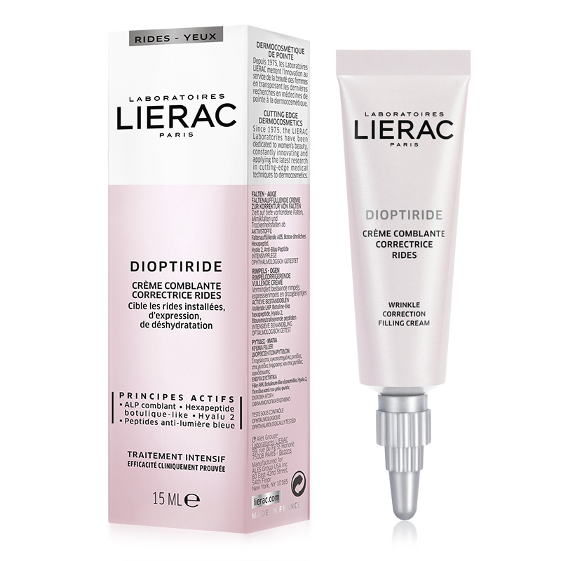 Diopticreme - Krem przeciwzmarszczkowy pod oczy. Skóra wokół oczu szczególnie narażona jest na wczesne oznaki starzenia oraz wiotczenie. Często pojawia się również przesuszenie oraz zmarszczki mimiczne. Lierac stworzył krem, który opiera się na wyciągach roślinnych o działaniu nawilżającym, anti-aging oraz naprawczym. Zmarszczki mimiczne zostają spłycone, wzrasta elastyczność oraz podnosi się poziom nawilżenia. Skóra jest doskonale chroniona przed negatywnymi czynnikami zewnętrznymi. W składzie znajdziemy kompleks składający się z przywrotnika, bluszczu oraz skrzypu, które doskonale wpływają na zwiększenie syntezy kolagenu i elastyny, co skutkuje ujędrnieniem newralgicznych okolic. Wyciąg ze śliwy przynosi optymalną dawkę nawilżenia oraz zmiękcza i uelastycznia skórę. Efektem stosowania jest widoczna redukcja zmarszczek oraz młodsze i pełne wigoru spojrzenie. Produkt przebadany oftalmologicznie.