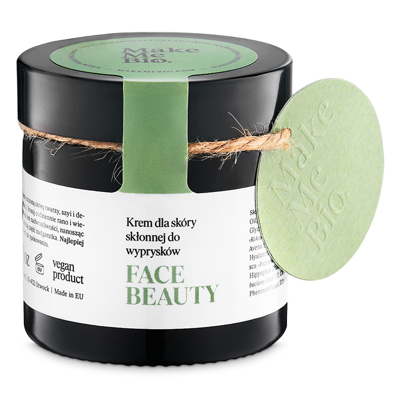 Łagodzący krem Make Me Bio to ratunek dla skóry skłonnej po przetłuszczania i powstawania wyprysków. Głównym składnikiem kremu jest olejek z drzewa herbacianego, znany ze względu na swoje właściwości antyseptyczne oraz przeciwzapalne. Doskonale oczyszcza i przyspiesza gojenie się zmian zapalnych. Olej z nasion słonecznika nie tylko wzmacnia naturalną barierę skóry, ale również działa przeciwzapalnie i antyoksydacyjnie. Takie połączenie olejów normalizuje wydzielanie sebum.