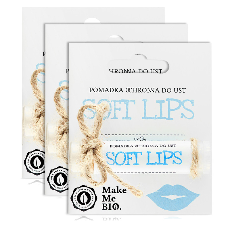 Soft Lips - Pomadka ochronna do ust. Regenerująca pomadka do ust stanowiąca remedium dla suchych i spierzchniętych ust. Odżywcza formuła łącząca w sobie drogocenne masła i oleje doskonale nawilża i regeneruje usta. Masło kakaowe oraz masło shea chronią usta przed szkodliwym działaniem czynników zewnętrznych. Olej rycynowy oraz olej makadamia silnie nawilżają usta oraz gwarantują im miękkość. Składnikiem, który sprawia, że pomadka Make Me Bio ma tak wspaniałe działanie jest miód! Dzięki bogactwu witamin rewelacyjnie odżywia, wygładza oraz uelastycznia skórę ust.