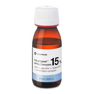 MD:Prepeel AHAs Complex 15% został zaprojektowany jako preparat do pielęgnacji domowej przed i po zabiegach linii md:ceuticalsTM Peel . Preparat stosujemy przed i między zabiegami, aby optymalnie przygotować skórę oraz zwiększyć efektywność kuracji.