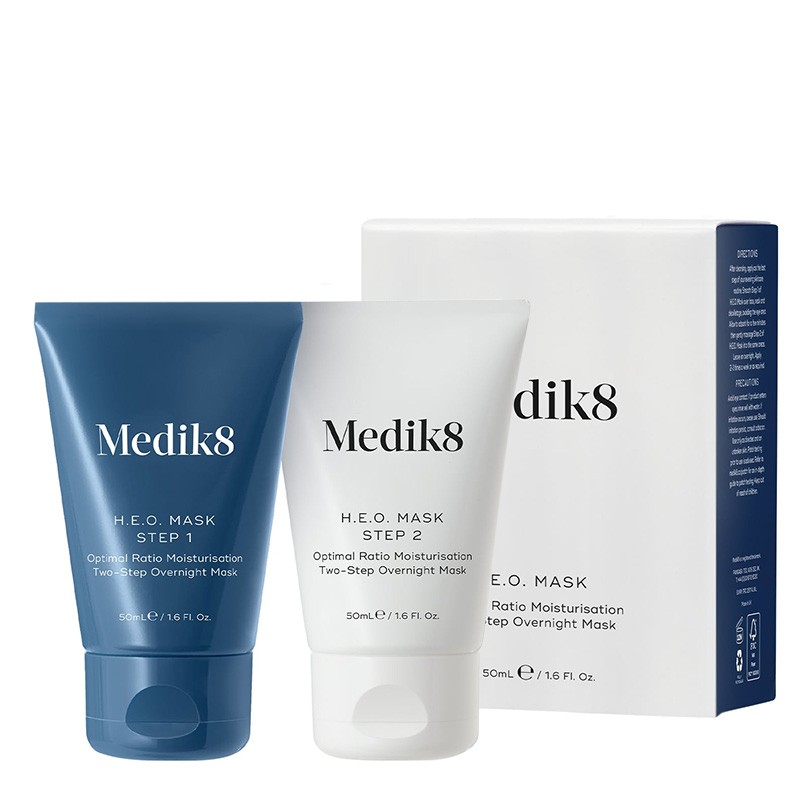Dwuetapowa, nawilżająca maska nocna Medik8 H.E.O. Mask to ciekawa propozycja dla skóry wymagającej dodatkowego wsparcia w nawilżeniu i odbudowie bariery ochronnej. Pierwszy krok - lekki, chłodzący żel o delikatnym, niebieskawym odcieniu - przyjemnie odświeża skórę, natomiast drugi etap to kremowa maska o bardziej otulającej konsystencji, która pomaga zabezpieczyć i odżywić skórę przez noc.