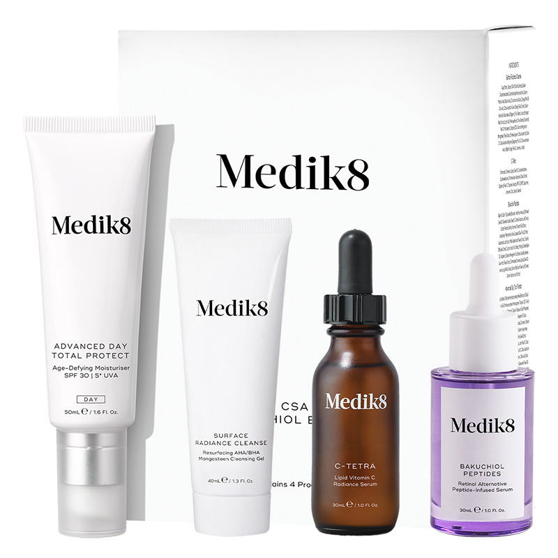 Składowa Medik8 Surface Radiance Cleanse Żel oczyszczający z mangostanem i kwasami AHA/BHA występuje w zestawie The Csa Kit Bakuchiol Edition w zmienionej objętości.