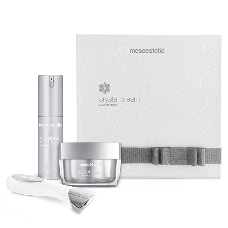 Crystal Cream + Crystal Eye Cream ZESTAW Krem do twarzy 50 ml + Krem pod oczy 15 ml + Stymulator jonizujący. Zestaw stanowiący intensywną pielęgnację skóry dojrzałej, z problemem fotostarzenia, wymagającej silnej odnowy i liftingu. Regularnie stosowany w widoczny sposób spłyca zmarszczki, ujędrnia i napina skórę, nadając jej młodzieńczego wyglądu. Stanowi doskonałą alternatywę dla inwazyjnych zabiegów medycyny estetycznej - bez użycia skalpela i ostrzykiwań. Dzięki synergii 3 składników takich jak: alga śnieżna, kompleks peptydowy, pigmenty oraz nowoczesnej technologii efekty przychodzą szybko i są długotrwałe. Algi śnieżne dzięki swojej wysokiej odporności na niekorzystne warunki środowiskowe jak wieczne lodowce i śnieg, nadają kremowi wyjątkowe właściwości przeciwstarzeniowe. Poprawiają one także obronę komórek skóry i jej mechanizmy naprawcze, a także posiadają doskonałą moc antyoksydacyjną i detoksykacyjną. Dzięki temu poprawia się napięcie i jędrność skóry, zmniejszają się zmarszczek, linie mimiczne są zmiękczone, a skóra rozjaśnia się i zyskuje bardziej jednolity kolor. Najnowszej generacji ekskluzywny kompleks peptydów, odbudowuje ubytki w skórze, pojawiające, pobudza syntezę białek podporowych oraz wykazuje bardzo silne działanie naprawcze i regenerujące. Obecne w preparatach pigmenty rozpraszają światło, ograniczają widoczność zmarszczek oraz rozświetlają skórę.