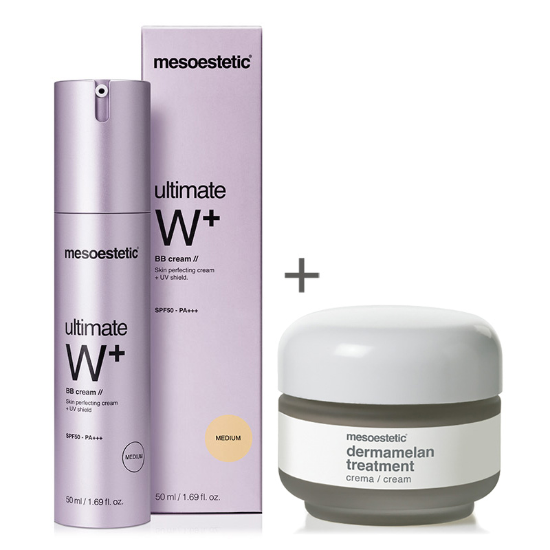 Ultimate W+ Whitening Cream BB Medium Krem BB wyrównujący koloryt - kolor MediumUltimate W+ Whitening Cream BB Medium - Krem BB wyrównujący koloryt - kolor Medium. Kosmetyk o wielofunkcyjnym działaniu. Idealny wybór w szczególności dla skóry suchej, normalnej, a także wrażliwej. Dzięki odpowiedniej kompozycji składników aktywnych krem stanowi połączenie ochrony, nawilżenia, wyrównania kolorytu, działania przeciewstarzeniowego i delikatnego makijażu. Wysoka ochrona przeciwsłoneczna SPF50 / PA+++ zapewnia jednoczesne zabezpieczenie przed promieniowaniem słonecznym, ponownym pojawianiem się przebarwień oraz procesem fotostarzenia. Wyjątkowy kompleks [meso]white complex® wykazuje potrójne działanie, jest to wybielanie i rozświetlanie widoczności ciemnych plam, zahamowanie aktywności tyrozynazy, a w rezultacie zmniejszenie wydzielania melaniny. Dodatkowo pieprznica siewna jest inhibitorem tyrozynazy, zmniejsza widoczność ciemnych plam na skórze i rozjaśnia je. Działanie to wzmacnia witamina E, która posiada właściwości antyoksydacyjne dzięki czemu chroni skórę przed wolnymi rodnikami. Dodatkowo pobudza wytwarzanie kolagenu, skóra jest bardziej napięta, a zmarszczki spłycone. Krem posiada pimenty, które optycznie wyrównują koloryt i ujednolicają go. Rezultatem jest piękna, odpowiednio nawilżona i rozświetlona cera o jednolitym kolorycie.