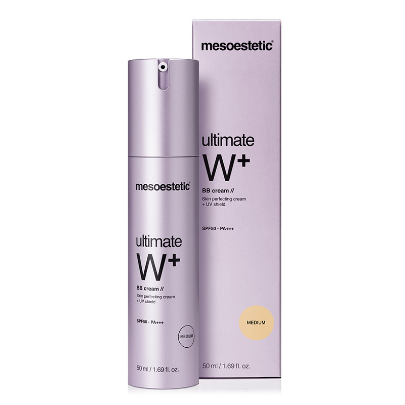 Ultimate W+ Whitening Cream BB Medium - Krem BB wyrównujący koloryt - kolor Medium. Kosmetyk o wielofunkcyjnym działaniu. Idealny wybór w szczególności dla skóry suchej, normalnej, a także wrażliwej. Dzięki odpowiedniej kompozycji składników aktywnych krem stanowi połączenie ochrony, nawilżenia, wyrównania kolorytu, działania przeciewstarzeniowego i delikatnego makijażu. Wysoka ochrona przeciwsłoneczna SPF50 / PA+++ zapewnia jednoczesne zabezpieczenie przed promieniowaniem słonecznym, ponownym pojawianiem się przebarwień oraz procesem fotostarzenia. Wyjątkowy kompleks [meso]white complex® wykazuje potrójne działanie, jest to wybielanie i rozświetlanie widoczności ciemnych plam, zahamowanie aktywności tyrozynazy, a w rezultacie zmniejszenie wydzielania melaniny. Dodatkowo pieprznica siewna jest inhibitorem tyrozynazy, zmniejsza widoczność ciemnych plam na skórze i rozjaśnia je. Działanie to wzmacnia witamina E, która posiada właściwości antyoksydacyjne dzięki czemu chroni skórę przed wolnymi rodnikami. Dodatkowo pobudza wytwarzanie kolagenu, skóra jest bardziej napięta, a zmarszczki spłycone. Krem posiada pimenty, które optycznie wyrównują koloryt i ujednolicają go. Rezultatem jest piękna, odpowiednio nawilżona i rozświetlona cera o jednolitym kolorycie.