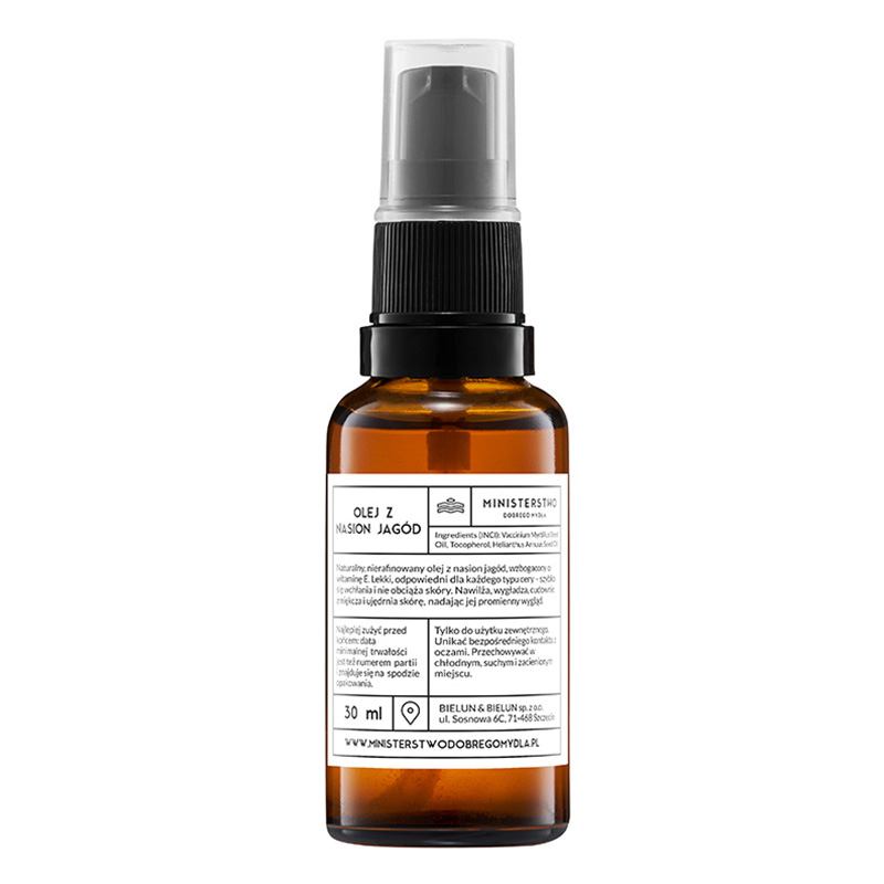 Naturalny, nierafinowany olej z nasion jagód odpowiedni do wzbogacenia codziennej pielęgnacji każdego rodzaju skóry. Produkt szczególnie dobrze sprawdzi się dla osób, które zmagają się z nadmiernym przesuszeniem, podrażnieniem, czy utratą blasku. Kosmetyk może być stosowany na skórze twarzy, ciała oraz w pielęgnacji włosów i paznokci.