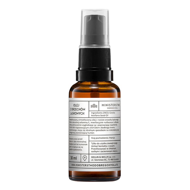 Orzech laskowy odżywia, regeneruje i intensywnie nawilża skórę. Doskonale sprawdzi się także po depilacji i goleniu, łagodząc ewentualne podrażnienie i zaczerwienienie. Przy regularnym stosowaniu oleju skóra staje się bardziej jędrna i elastyczna w dotyku.