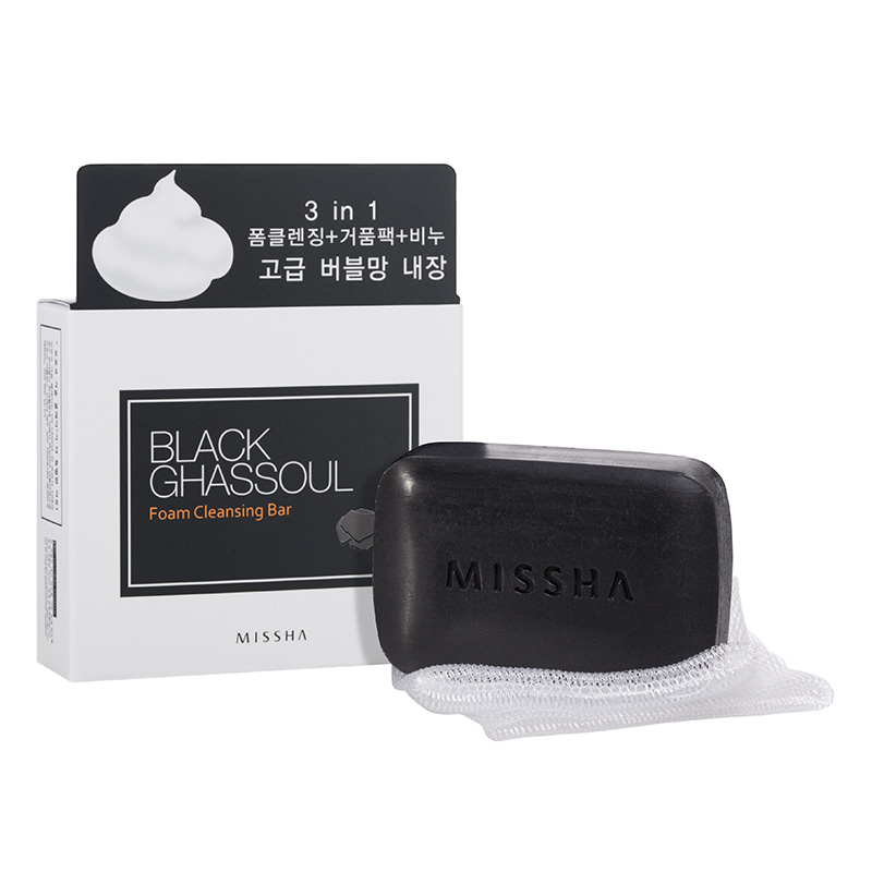 Black Ghassoul Foam Cleansing Bar - Mydło z marokańską glinką mineralną. Produkt poza glinką Ghassoul zawiera również naturalny węgiel drzewny, które skutecznie usuwają wszelkie zanieczyszczenia i resztki makijażu. Glinka ponadto zmniejsza wydzielanie łoju, złuszcza martwy naskórek, zwęża pory skóry, oraz ją regeneruje. Węgiel koreański natomiast łagodzi skórę i ją dogłębnie oczyszcza.